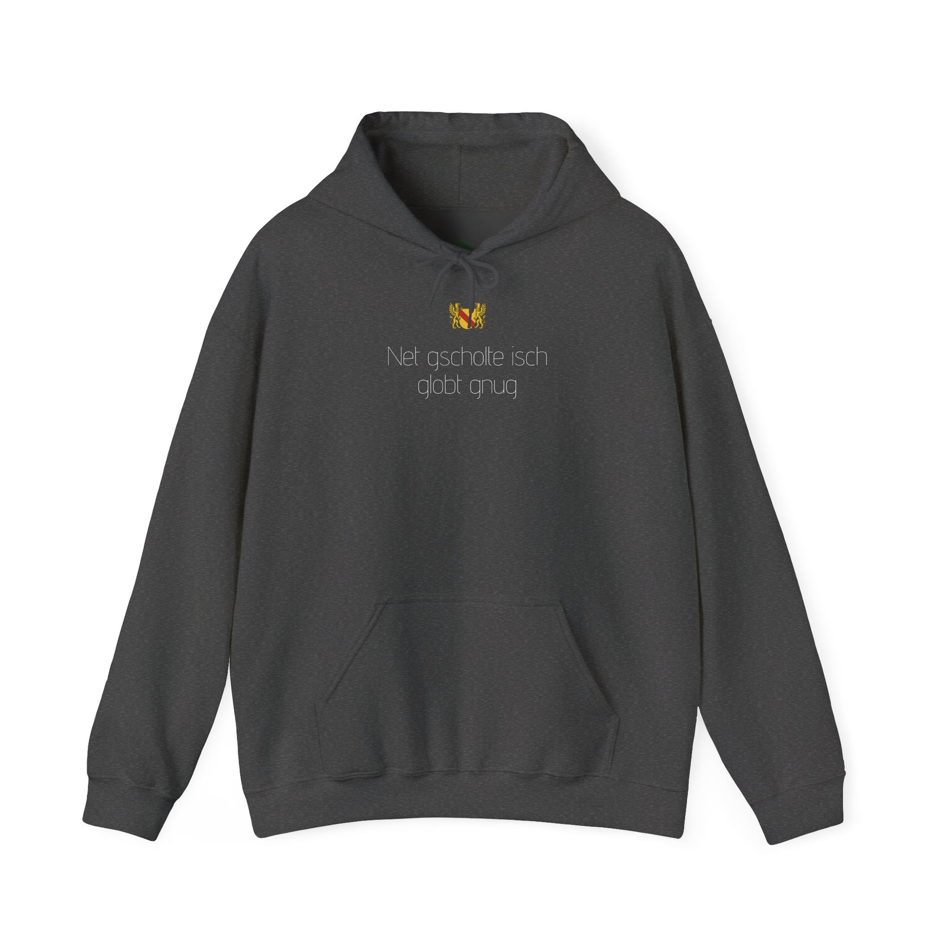 Dieser Hoodie trägt eine der ehrlichsten badischen Weisheiten: „Net gscholte isch globt gnug.“
