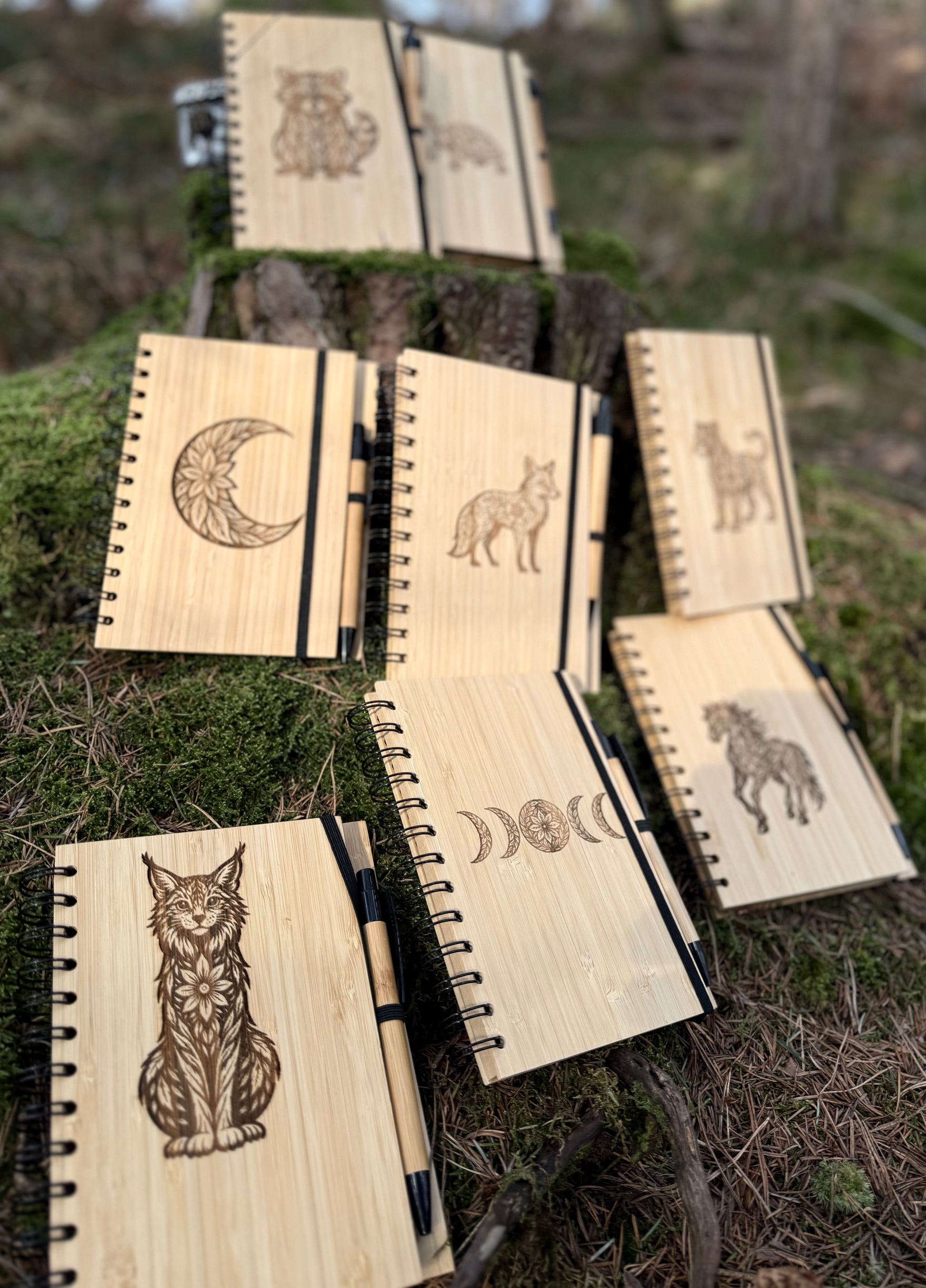 Diese Notizbücher bestehen aus stabilem Bambus und besitzen eine robuste Spiralbindung. Jedes Buch zeigt ein klar graviertes Motiv wie Fuchs Katze Hund Waschbär Schildkröte Pferd oder ein naturbezogenes Symbol. Die Motive sind präzise eingebrannt und verleihen jedem Buch eine eigenständige Optik. Ein passender Stift ist seitlich befestigt.